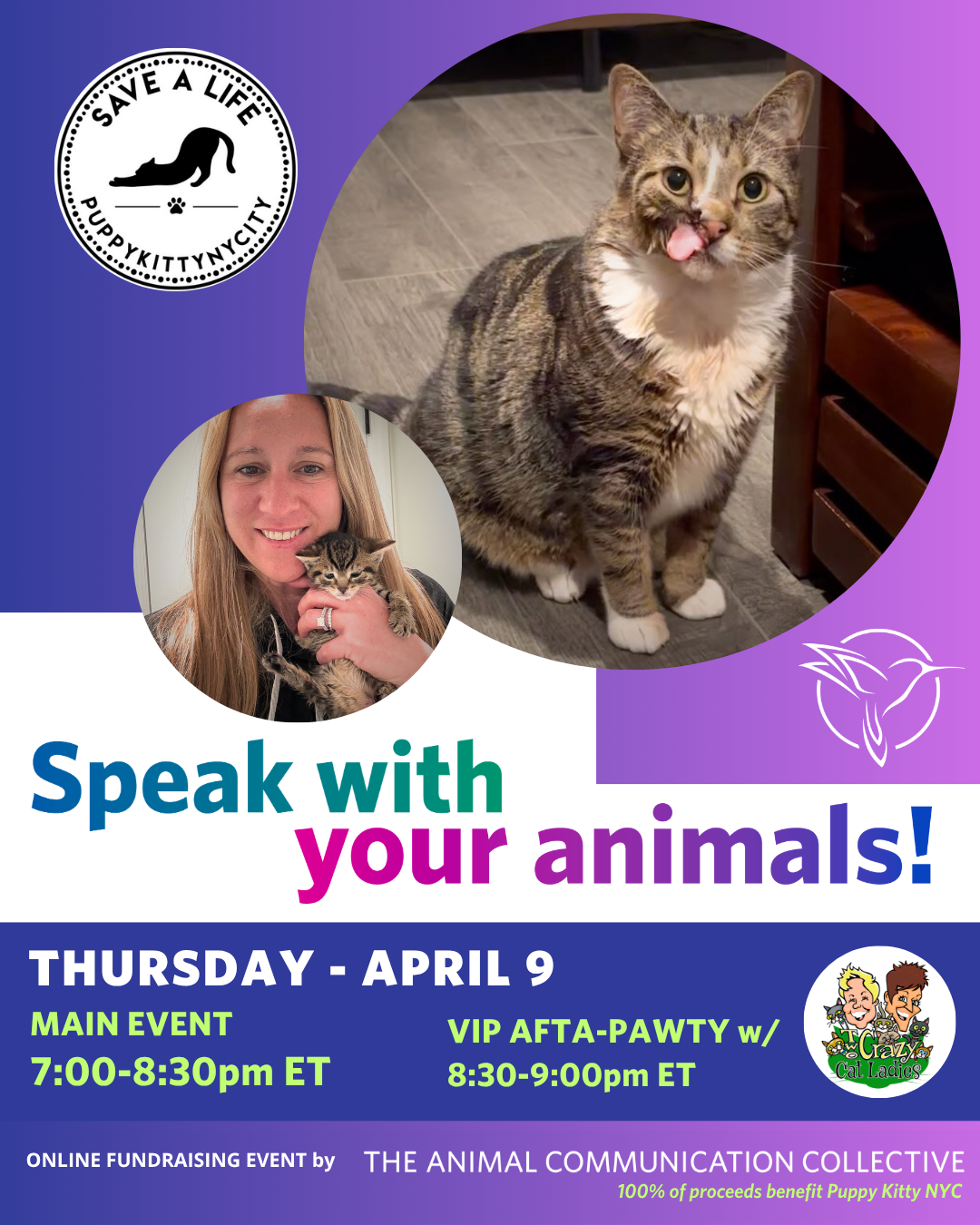 Join us for an intimate event where 6–7 attendees will be intuitively selected for mini-readings with their animals—alive or in spirit. Stick around for the special Afta-Pawty with the Two Crazy Cat Ladies, where you can meet the Ladies, ask kitty health questions, and discover the amazing resources on their website!